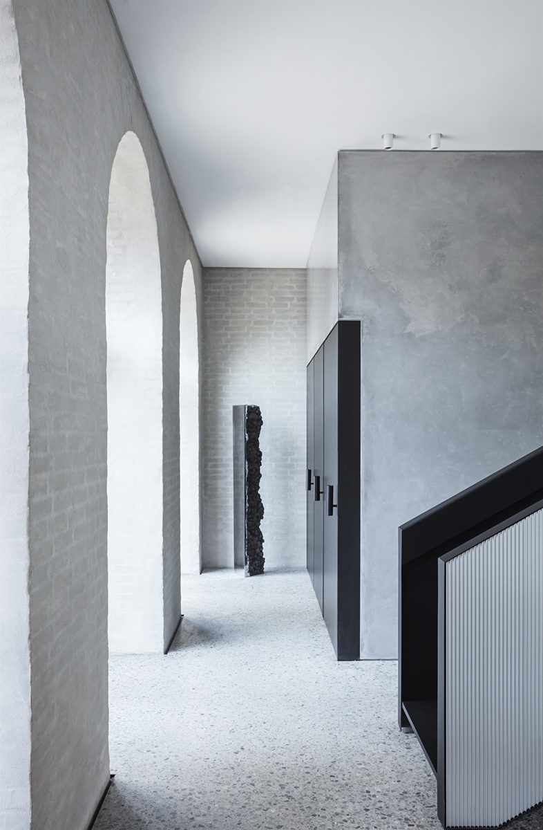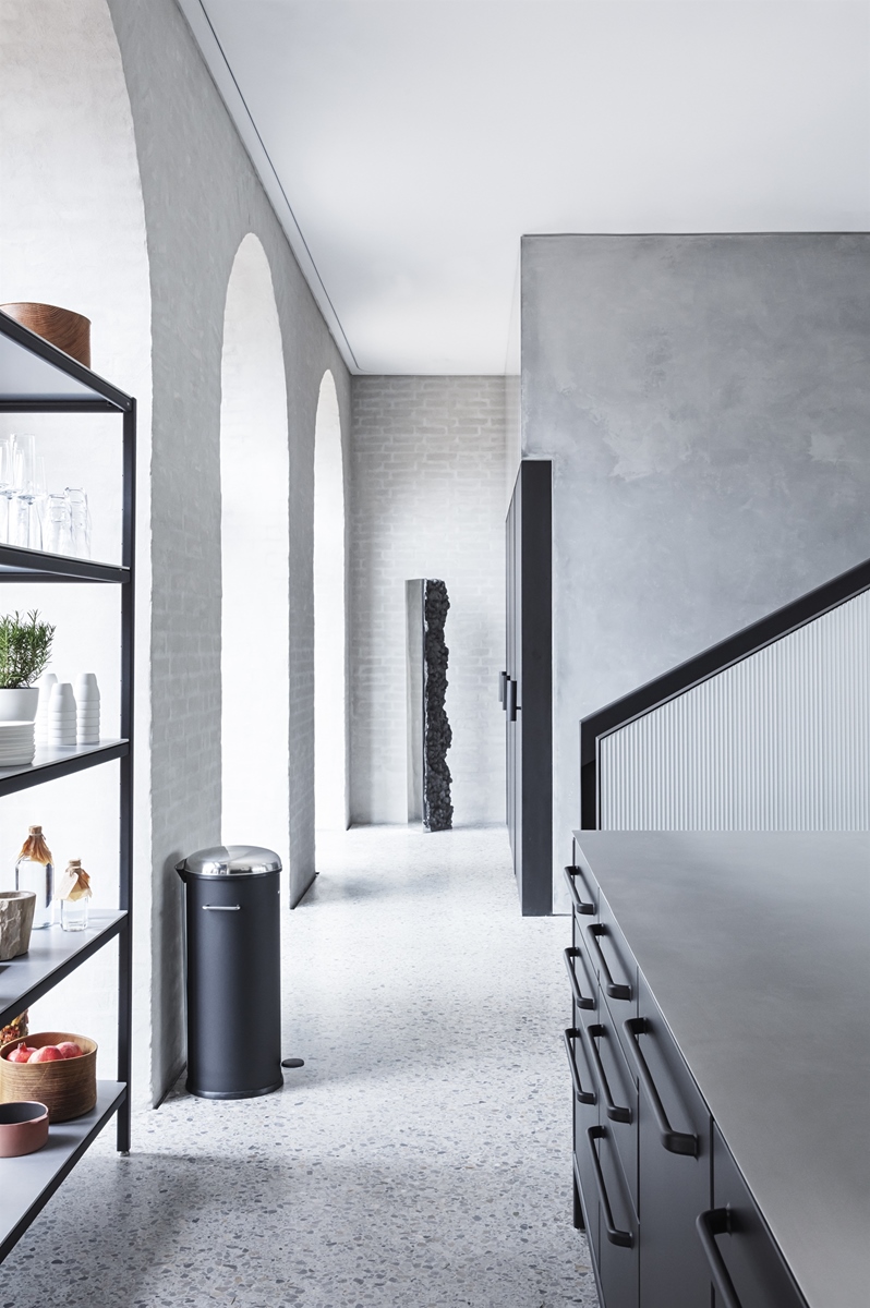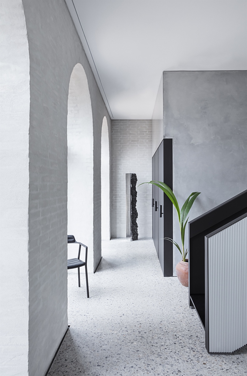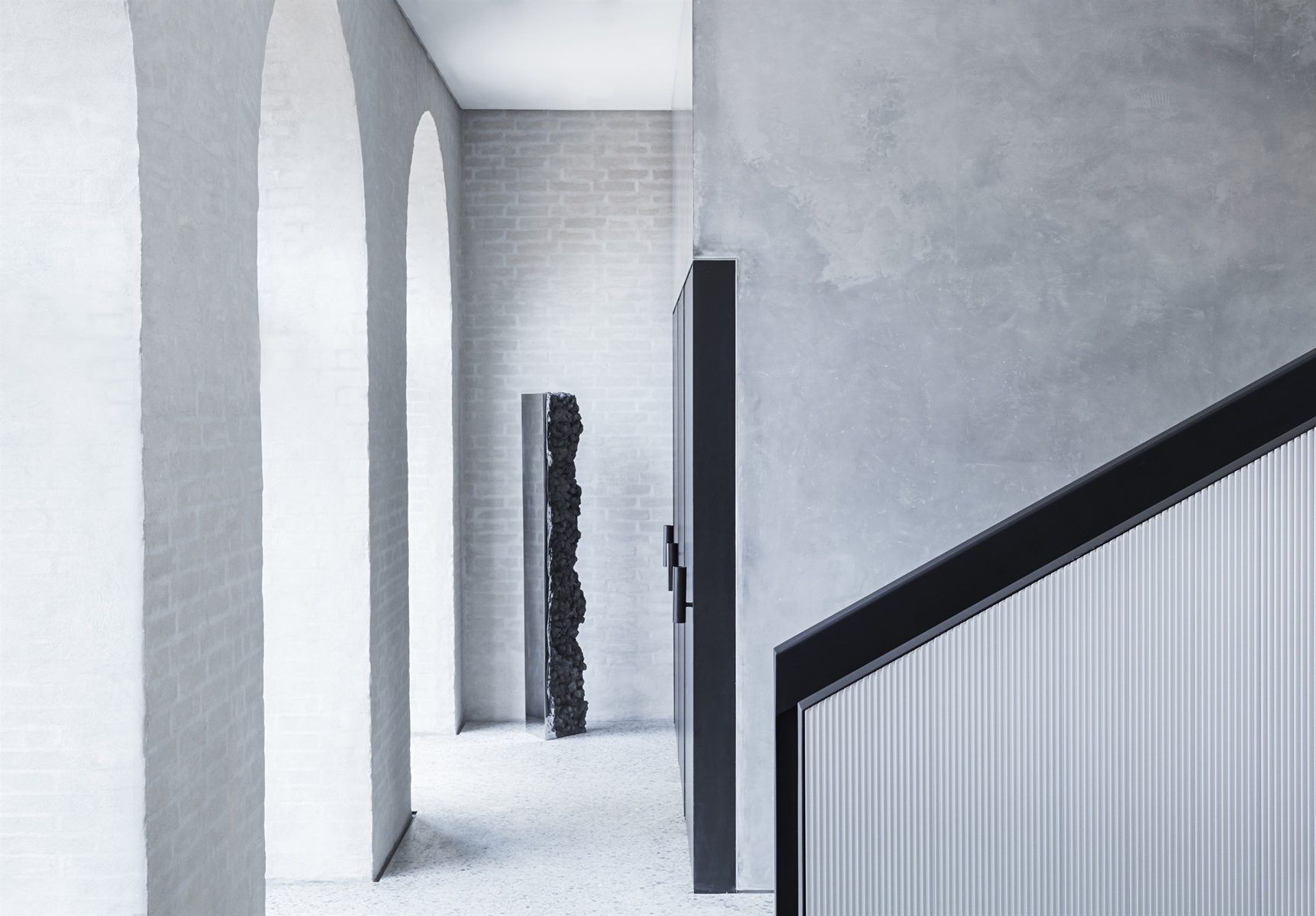 Hz Flex 017 er en fleksibel akustikplade på kun 15 mm, hvilket gør den ideel til projekter, hvor loftshøjden skal bevares eller maksimeres – især i ældre bygninger som Vipp Chimney House. Resultatet er et stilrent akustikloft, der visuelt komplimenterer husets minimalistiske æstetik og sikrer en behagelig lydoplevelse i de store, åbne rum. Det diskrete design understøtter arkitekturen, hvor materialer som stål, terrazzo og glas forenes. Indbyggede gardinskinner er elegant integreret i akustiklofterne og bidrager til det strømlinede udtryk.
